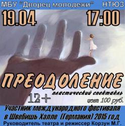 19 апреля в 17:00 во Дворце молодежи пройдет показ пластического спектакля «Преодоление» от театра юного зрителя.