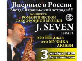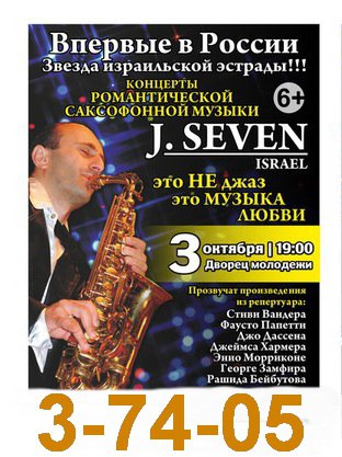 J.Seven в сопровождении своей музыкальной группы даст сольный концерт романтической саксофонной музыки. На сцене прозвучит золотая коллекция мировых шедевров, любимые вами мелодии известных композиторов: Фаусто Паппетти, Джо Дассен, Стиви Вандер, Энио Мариконэ, Георге Замфир (одинокий пастух) Джеймс Хармер (музыка из к.филма Титаник), Рашид Бейбутов(….полумесяцем бровь) и многое другое.