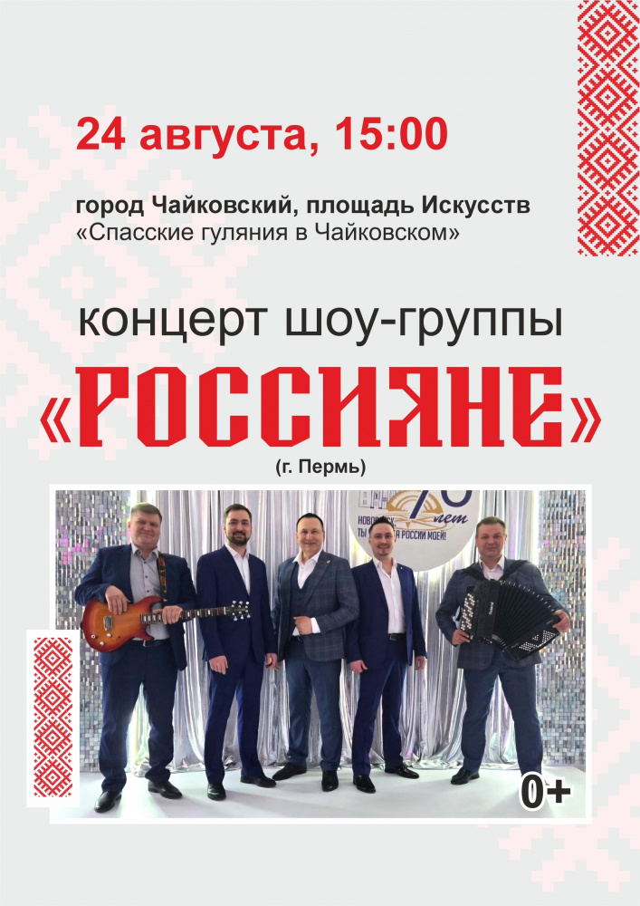 Живое исполнение каверов российских хитов 80-х, 90-х, 2000-х и современности – чайковцев приглашают на грандиозный концерт пермской вокально-инструментальной шоу-группы «Россияне». Коллектив выступит на главной сцене «Спасских гуляний», которые развернутся 24 августа с 15.00 на площади Искусств.