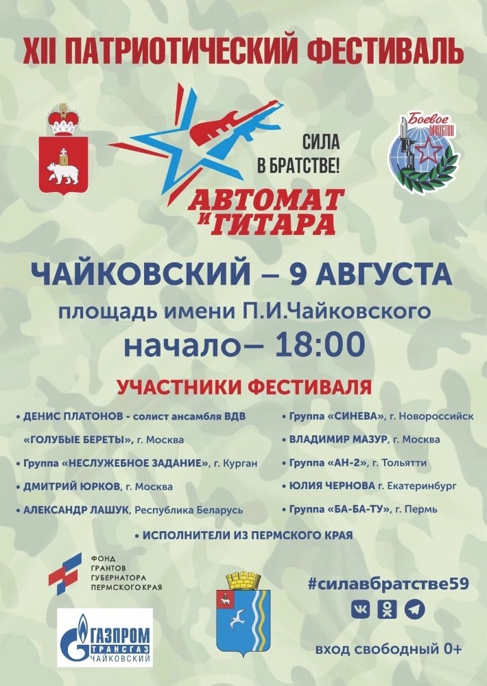 В Чайковском 9 августа пройдёт патриотический фестиваль «Автомат и гитара - Сила в братстве».