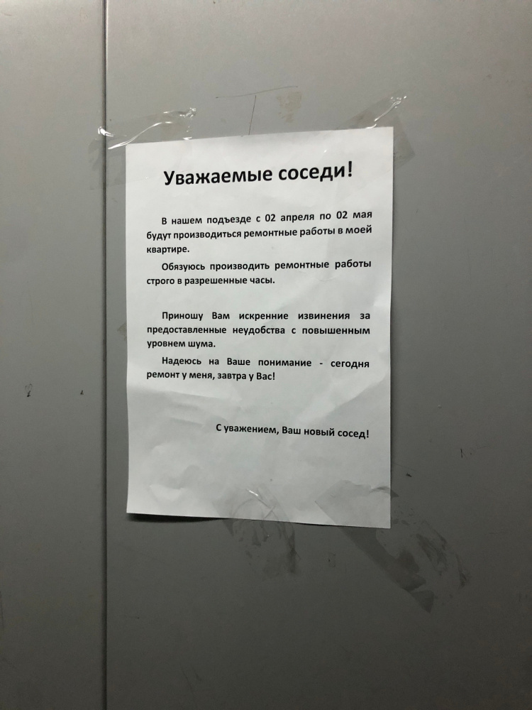 Помимо срока проведения ремонтных работ в объявлении сообщается о том, что данные работы будут осуществляться строго в разрешённые часы. Также новосёл заранее приносит извинения за строительный шум, который может создать определённые неудобства соседям.