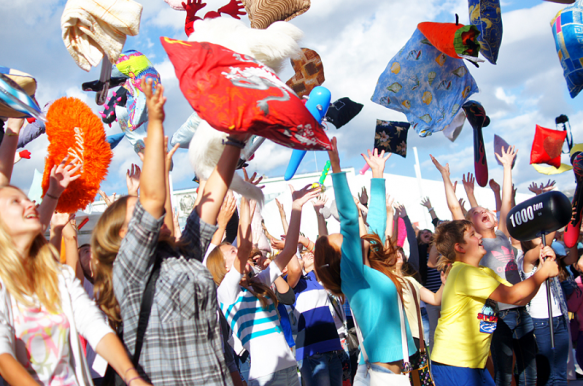 Организаторы мероприятия предложили всем желающим поучаствовать в побоище, вооружившись «мягким оружием» - подушками, надувными топорами и секирами, а также мягкими игрушками.