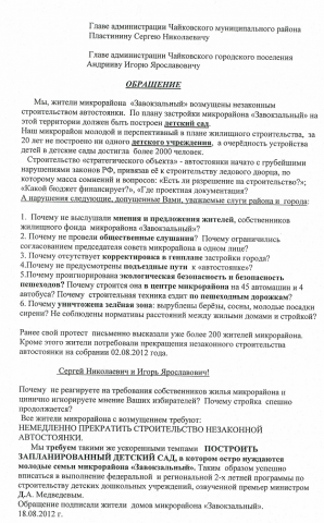 У жителей района возникло много вопросов к властям. Обсудив их на собрании 2 августа 2012 года, граждане решили оформить свои претензии на бумаге.