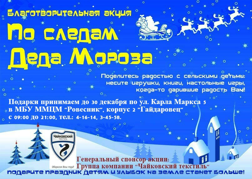 Активисты молодёжного центра «Ровесник» объявили о старте ежегодной благотворительной акции «По следам Деда Мороза». Главная цель мероприятия - поздравить с Новым годом детей из отдалённых деревень Чайковского района. Поэтому организаторы акции просят откликнуться жителей города и района.