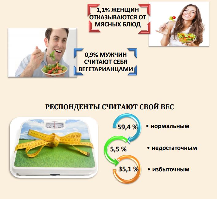 Возможно, это связано с проблемой лишнего веса, поскольку 35.1 % жителей Пермского края признались, что оценивают свой вес, как избыточный. Недовесом страдают 5.5 %, а 59.4 % респондентов считают свой вес нормальным.